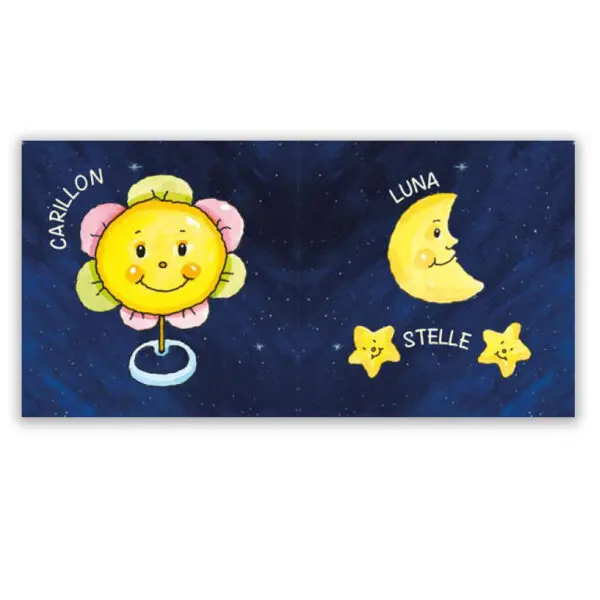 All’interno è presente l’associazione parola – immagine, così da guidare il bambino nel riconoscimento degli oggetti presenti nel momento della nanna.